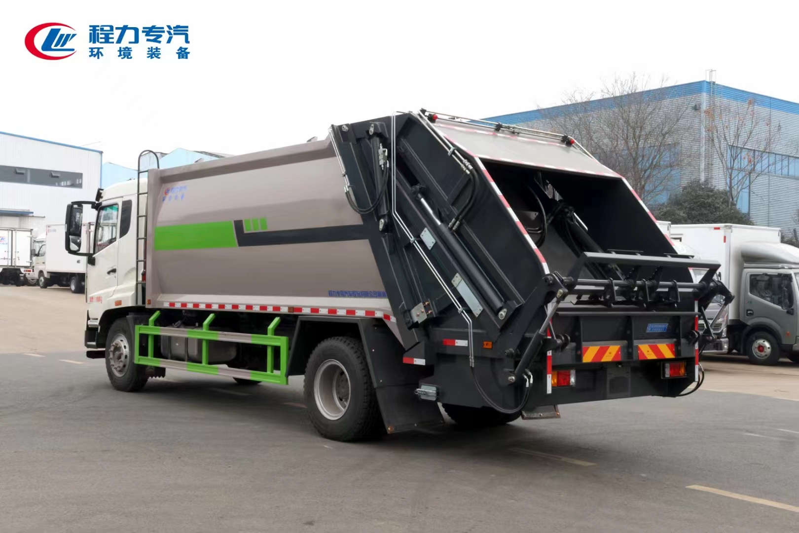 上裝配置 上裝為弧形箱體結(jié)構(gòu),采用Q345(局部采用T710)高強(qiáng)度板制作。有效容積15-18立方,采用中梅大通徑五聯(lián)手氣一體多路閥,全系標(biāo)配背壓閥(增加雙向壓縮比),合資鐵殼液壓齒輪泵,嘉善取力器,中梅手氣一體多路閥,恒力油缸(質(zhì)保兩年),加強(qiáng)型掛捅后翻轉(zhuǎn)機(jī)構(gòu)(可選裝三角斗、全密封斗、擺臂等翻轉(zhuǎn)機(jī)構(gòu)),外置滑板缸結(jié)構(gòu)設(shè)計,石墨烯尼龍滑塊,長沙福力CAN總線控制系統(tǒng),尾部帶有硅膠控制面板,標(biāo)配無線遙控,帶光電感應(yīng)保護(hù)裝置,標(biāo)配后污水箱,(中聯(lián)樣式雙排污口),可加裝側(cè)邊污水箱。加裝氣動密封蓋。